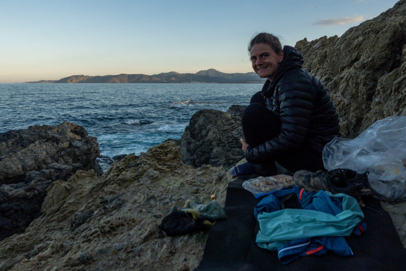 Ich werde wahrscheinlich nicht so viel Schlaf bekommen, aber ich bleibe trotzdem. Für das Abenteuer. Die Wellen rauschen direkt neben mir, über mir leuchten die Sterne und morgen früh habe ich einen direkten Blick auf den Sonnenaufgang. Nur die Mücken machen mich verrückt. Es ist total windstill und sie kommen alle aus ihren Verstecken um mich zu ärgern. Ich verkrieche mich in meinen Schlafsack, aber das ist viel zu warm. Es sollen die ganze Nacht 18 Grad bleiben. Irgendwann, als es längst dunkel ist, habe ich eine Idee. Ich hänge mein Innenzelt aus, mache 2 Abspannleinen vom Außenzelt ab und knote sie oben ans Innenzelt. Dann hänge ich es an den Felsen auf, nutze die Trekkingstöcke als Abstandshalter und lege mich hinein. So hängt es mir nicht ins Gesicht und ich kann ohne Schlafsack und ohne Mücken ruhiger schlafen. Oder einfach nur da liegen. Ich habe die Felsen mit meinen Klamotten gepolstert und liege auf der dünnen Schaumstoffmatte. Es ist trotzdem uneben und hart. Aber hey – ich habe schon drei Sternschnuppen gesehen. Man kann nicht alles haben.