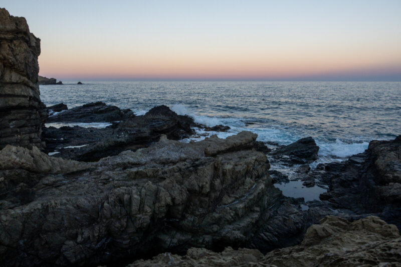 Es fühlt sich wie ein Pausentag an. Nach unserem Sonnenaufgangs-Baden und nachdem wir uns verabschiedet haben, bleibe ich auf den Felsen am Wasser sitzen und schreibe.
