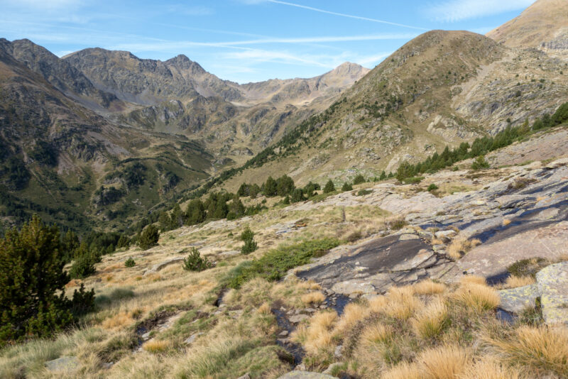 Der markierte Pfad führt nach einer Weile nach unten in Richtung der unbemannten Hütte Refugi de Coms de Jan. Ich hatte von einer Alternative gelesen, die weiter auf dieser Höhe am Hang entlang führt und erst kurz vor der Hütte nach unten abbiegt. Das hört sich besser an. Dann gehe ich nicht so viel unten durch das Tal.