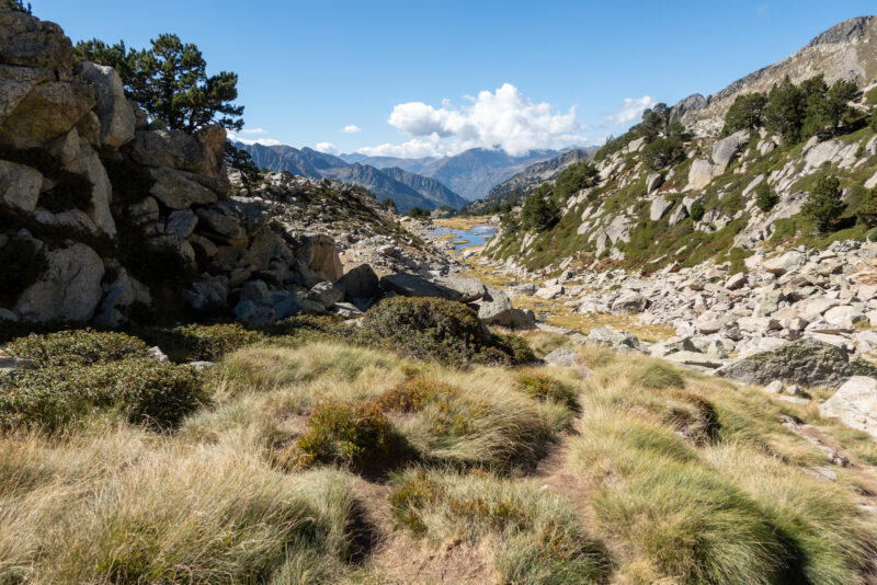 Zwischen Tannen, über Felsen und über die Wiese geht es noch 200 Höhenmeter nach oben. Dort ist ein See, wo ich bleiben will. Direkt vor dem Anstieg zum Gipfel morgen. Die perfekte Ausgangslage. Der Pic Carlit liegt nun direkt vor mir. Es ist der höchste Berg der östlichen Pyrenäen. Und da geht es morgen früh hoch. Ich freue mich schon.