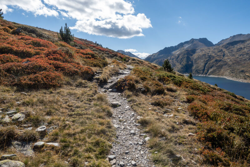 Der Pfad wird breiter, ich komme an einer Hütte vorbei und an verfallenen Ruinen. Der See ist auch wieder ein Stausee. Drumherum folge ich einem schmalen Pfad.