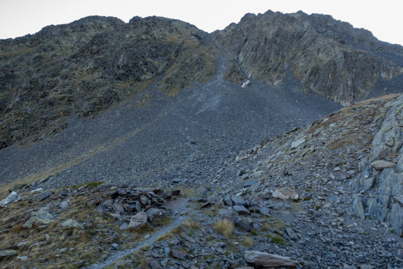 Ich suche den Pfad und folge ihm über die Wiese auf einen Hügel. Dann startet der steile Geröll-Anstieg. Die Kehren kann man schon von unten sehen. Auf dem Foto sieht es gar nicht so steil aus.