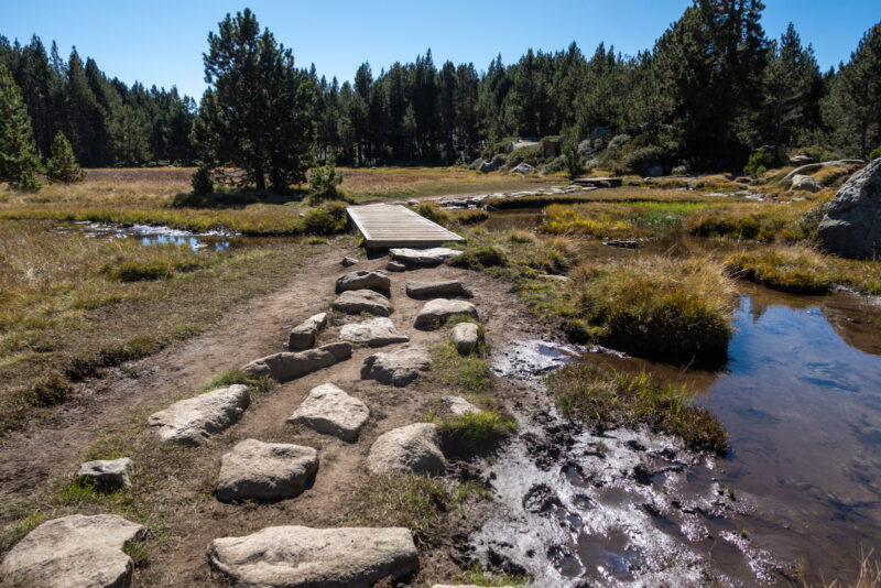 Ich laufe entgegen der ganzen Leute an Seen vorbei, zwischen Tannen hindurch, über Felsen und Gras. Es geht wenig steil nach unten. Immer wieder auch über flache Ebenen. An jedem See steht ein großes Holzschild mit dem Namen und dass man nicht schwimmen darf. Aber Zelten ist zwischen 19 und 9 Uhr erlaubt.
