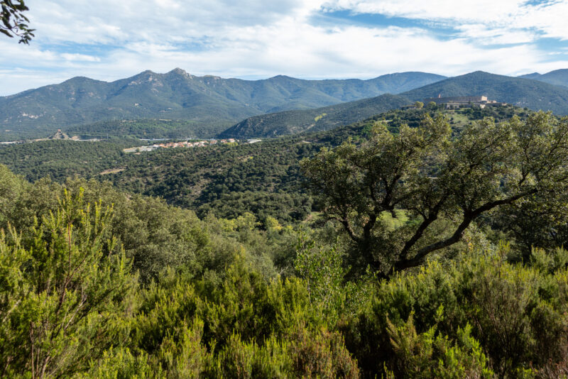 Wir kommen an einer Ruine vorbei und folgen der Asphaltstraße unterhalb einer alten Festung. Über einen Pfad geht es zu einem großen Parkplatz. Le Perthus ist ein kleiner Grenzort. Auf dieser Seite der Straße ist man in Frankreich, auf der anderen Seite in Spanien. Wahrscheinlich gibt es hier auch wieder irgendwelche Steuervorteile. Im Supermarkt gibt es vor allem Alkohol und Tabak. Außerdem alles in Großverpackungen. Wie am Flughafen. Ich kaufe ein Baguette und etwas Käse für die Pause gleich. Außerdem noch eine Tüte Chips für den letzten Abend im Zelt. Frisches Obst gibt es leider nicht.