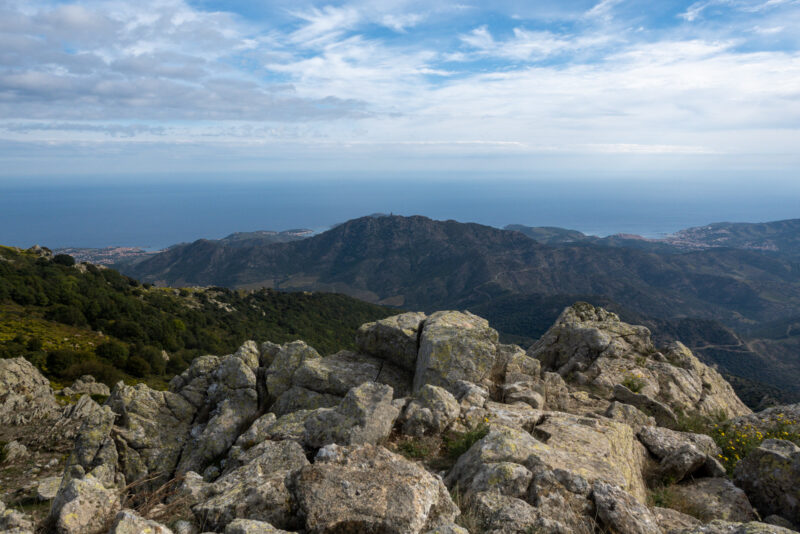 Jetzt geht es nach unten. Die Büsche werden höher und ich steige über viele Steine hinab. Die Franzosen überhole ich wieder, sie haben sich schon einen windstillen Pausenplatz gesucht. Ich gehe noch ein Stück weiter. An einem Stück Hang ohne Bäume finde ich ein schönes Plätzchen mit direktem Blick auf Banyuls.