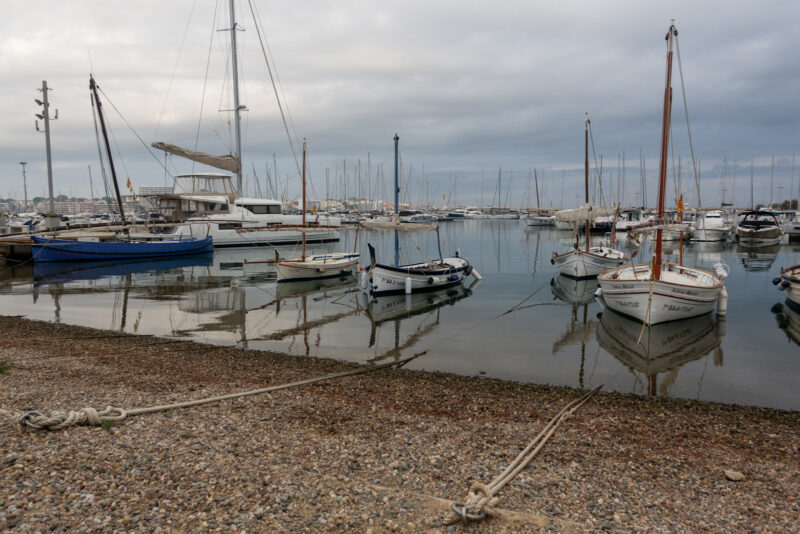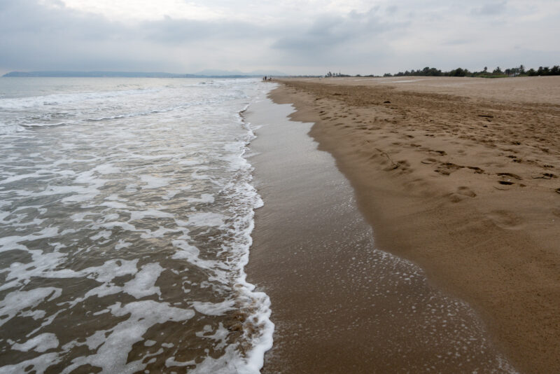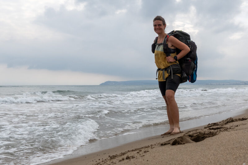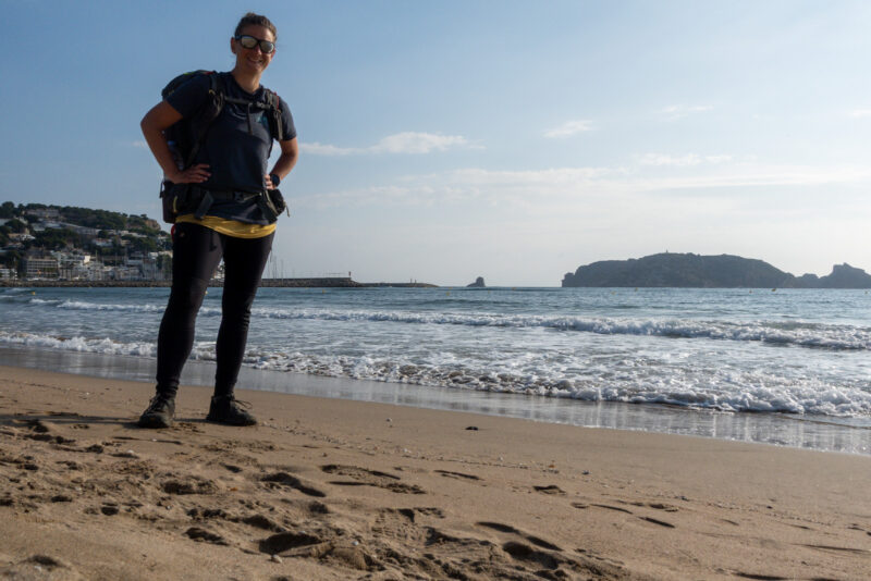 Der Weg führt durch Sant Pere und bis Sant Martí d’Empúries nochmal ein ganzes Stück weg vom Wasser. Ich ziehe stattdessen meine Schuhe und Socken aus und mache die nächsten 6 Kilometer barfuß einen Strandspaziergang. Direkt vorne am Wasser ist der Sand so fest, dass ich nicht so sehr einsinke und es nicht so anstrengend ist. Außerdem kühlt das Wasser meine Füße und Beine, wenn wieder eine Welle kommt.