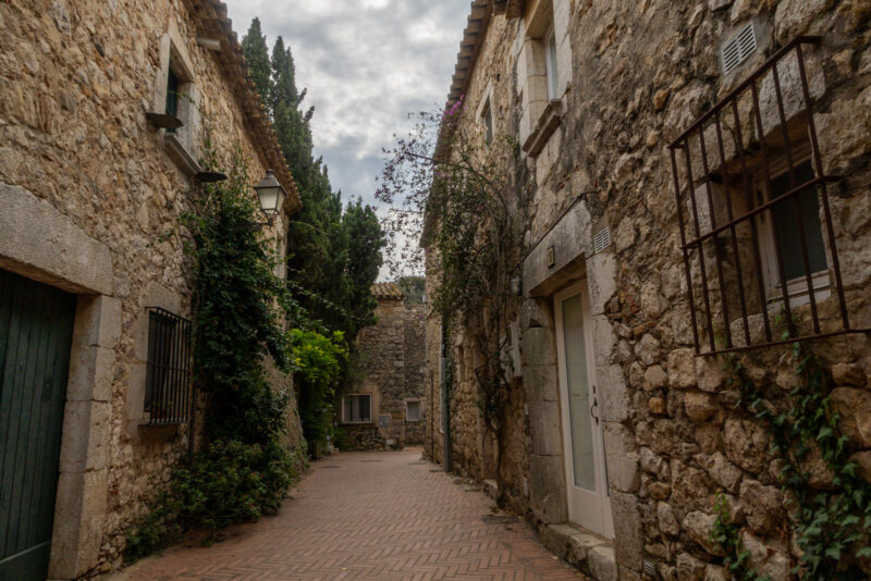 Ich entsande meine Füße und ziehe meine Schuhe wieder an. Dann geht es weiter auf befestigten Wegen hinter den Dünen. In Sant Martí d’Empúries gehe ich durch enge Gassen. Die sind typisch für spanische und auch französische kleine Orte. Jedenfalls ist da irgendwo eine Verknüpfung in meinem Kopf aus bisherigen Reisen und Urlauben.