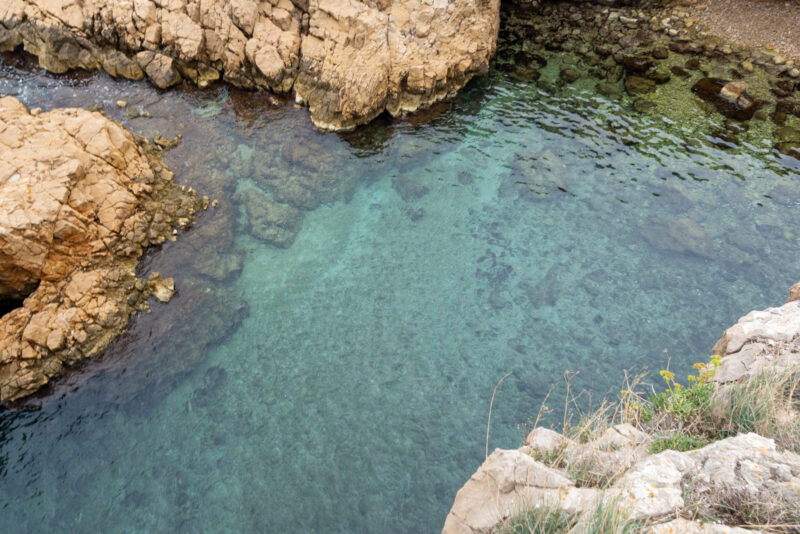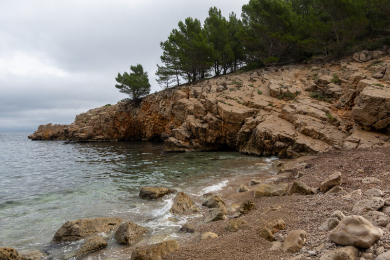 Ich folge einer Schotterstraße und einem breiten steinigen Weg durch lichten Wald. Irgendwann geht es dann über einen Pfad abwärts. Zu einer kleinen Bucht mit Sandstrand. Der Wegweiser zeigt 1:47 Stunde bis nach L’Estartit an. Das habe ich zwischendurch immer wieder gesehen in Spanien. Diese genauen Zeitangaben. Ich folge nun dem Wanderweg El Camí und nicht mehr dem GR92. Der führt nämlich weiter den breiten, eher langweiligen Weg entlang und nicht über die Klippen und an den kleinen Buchten vorbei.