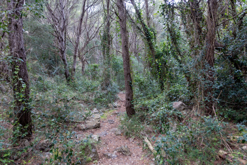 Ich steige den steinigen Pfad hinab, zwischen kleinen Sträuchern hindurch. Weiter unten gehe ich dann durch den Wald, wo die Baumstämme mit Efeu umwickelt sind.