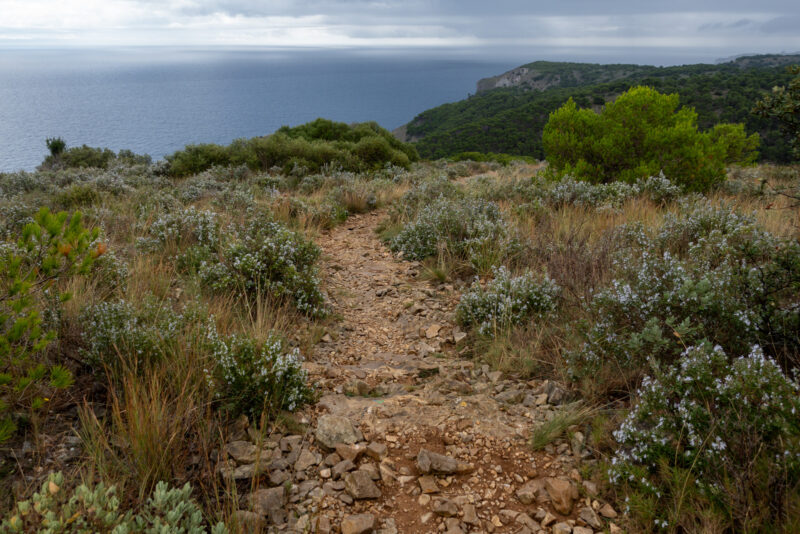 Ich komme an der Bucht vorbei und es geht wieder nach oben. Aus dem Wald raus und wieder mit Meerblick an niedrigen Büschen vorbei. So geht es ein paar Mal.