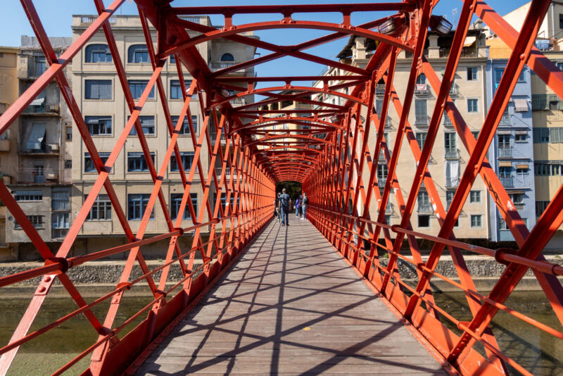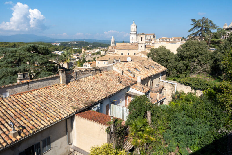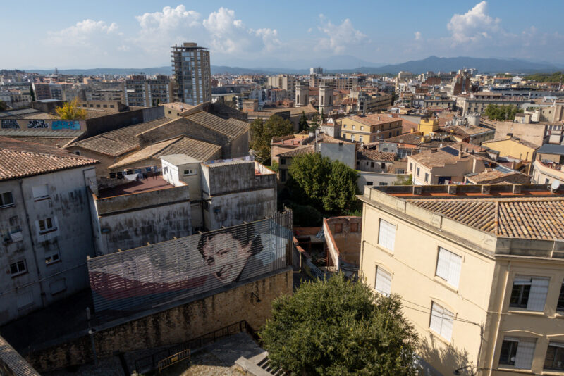 Der Bus nach Girona fährt etwa 1,5 Stunden. Ich steige am unterirdischen Busbahnhof aus. Am Bahnhof wimmelt es von Polizisten in Schutzkleidung und mit Schlagstöcken. Ich sehe viele Leute mit palästinensischen Flaggen. Später lese ich, dass es einen Generalstreik gibt. Dass aus Solidarität mit Palästina demonstriert wird im ganzen Land. Gut, dass ich nicht heute heimfahren wollte, es verkehren nämlich keine Züge. Ich will am Bahnhof an der Info ein Namensschild für meinen Rucksack besorgen, was im TGV vorgeschrieben ist. Ein bulliger Polizist bittet mich aber etwas unwirsch, den Bahnhof zu verlassen. Also laufe ich draußen am Bahnhof entlang, es ist laut und voll und stinkt. Ich verstecke meine Tränen unter der Sonnenbrille und laufe weiter. Ich wusste nicht, das Girona eine so große Stadt ist. Jetzt bin ich dann plötzlich ganz zurück in der Zivilisation. Ich kann noch nicht einchecken im Hotel, erst ab 14 Uhr. Also steuere ich die noch erhaltene Stadtmauer an, auf der man die Altstadt umrunden kann. Da ist es bestimmt weniger voll. Die Tränen trocknen. Die erste Großstadt-Krise und der Drang, lieber wieder wandern zu wollen, ist überstanden.